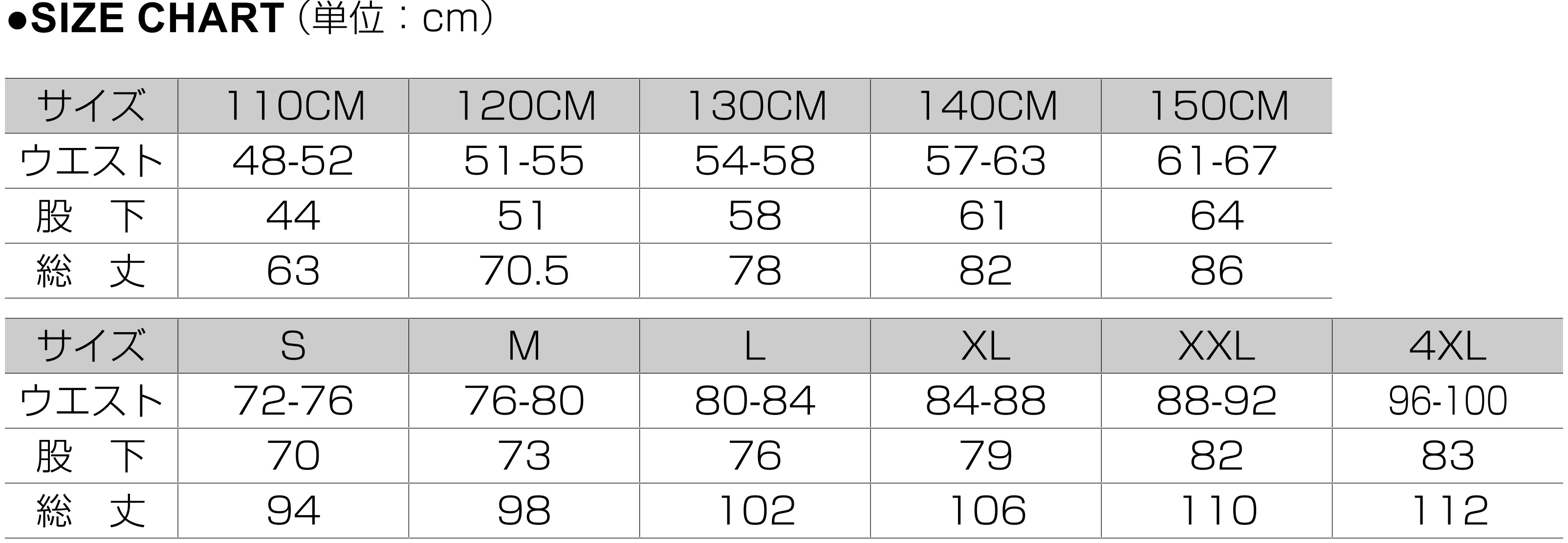 | Size | S | M | L | XL | 4XL | 110 | 120 | 130 | 140 | 150 | XXL |