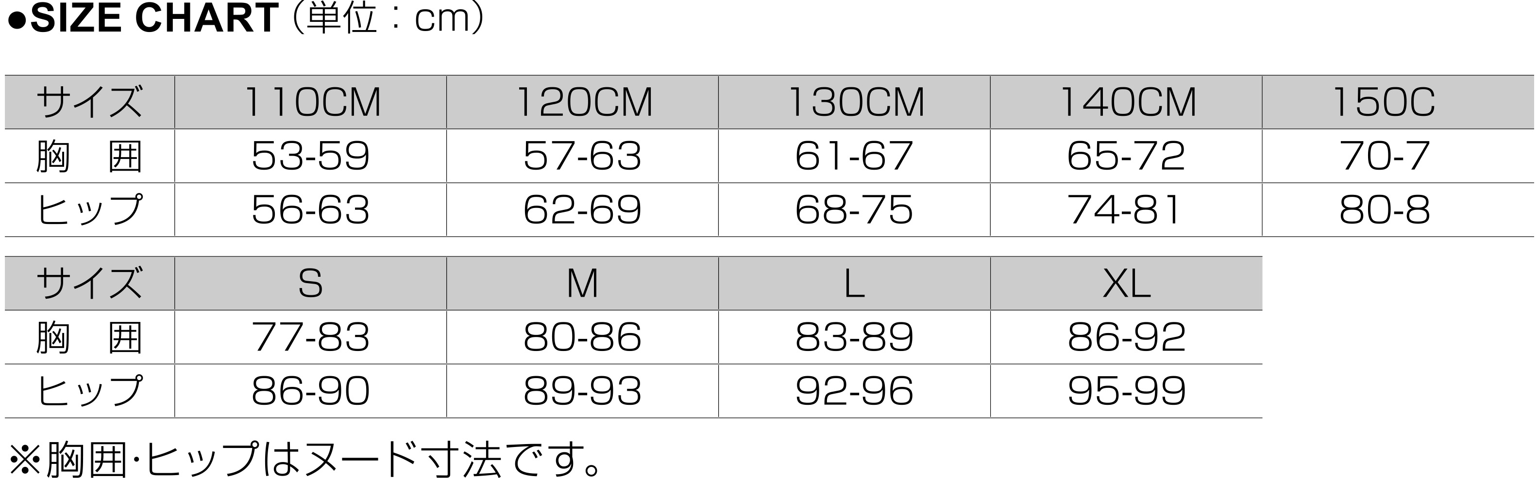 | Size | S | M | L | XL | 110 | 120 | 130 | 140 | 150 |