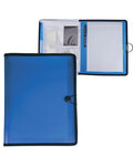 - Full-size organizer/folio with expandable folder pocket with hook and loop fastener, CD/DVD and business card slots on left side, writing pad on right side