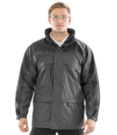 Ripstop polyester with PVC coating. Polyester fibre inner with Active Fleece upper body and polyester lower body lining. Waterproof 4000mm with taped seams. Windproof. Detachable, adjustable lined hood with chin guard. Full length zip with tear release storm flap. Zip opening, mesh backed underarm vents. Various pockets including two large front, two chest and three inner pockets. D-ring. Reflective back patch on lower back. Part elasticated adjustable cuffs. Adjustable drawcord waist and hem. Cut out label. Access for decoration.