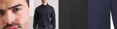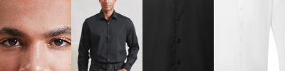 Men’s poplin shirt made with certified recycled polyester and cotton. Stiffened formal collar with top button. Full button-through with pearlised buttons on white and self-coloured on black. Two-button adjustable cuff with cufflink hole. Sleeve guard with single button. Curved hemline. Back darts and yoke for overall fit and shape. Easycare fabric.