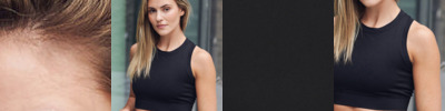 Women’s cropped tank. Seamless fabric. Single-layer front. Self-fabric binding around neck and armhole. Ribbed hem.
