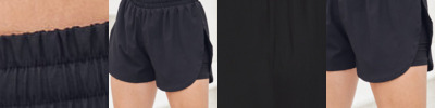 Women’s double-layer sports shorts. Four-way stretch fabric. Undershort made from stretch interlock fabric with wicking properties, and with phone pocket on left-hand side (as worn). High side vents for easy movement. Self-fabric elasticated waistband. Internal drawcords.