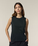 The Stella Ava fitted tank top for women. Sleeveless. 1x1 rib binding at collar and armhole. Overlock at back neck. Twin-needle topstitches at hem.