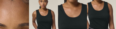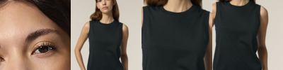 The Stella Mia tank top for women. Medium fit. Sleeveless. 1x1 rib at collar and armhole. Back neck tape in self-fabric. Twin-needle topstitches at hem.