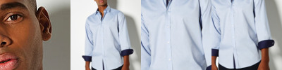 Fused collar. Stand up button down collar. Single needle stitched armholes. Twin needle stitched sleeve and side seams. Contrast inner collar stand, inner cuff and placket. Contrast binding down centre of button placket. Back yoke. Rounded hem. 2 spare bu