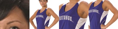 - Contrast color self-material inserts on shoulders, curved across back of shoulders, moving down both sides, under arms coming to a point facing down