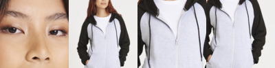 Charcoal 52% ringspun cotton/48% polyester. Soft cotton faced fabric. Brushed back fleece. Raglan sleeves. Contrast double fabric hood with flat lace drawcord. Full length contrast plastic YKK zip. Contrast sleeves. Front pouch pockets. Ribbed cuffs and hem. Twin needle stitching. Tear out label.