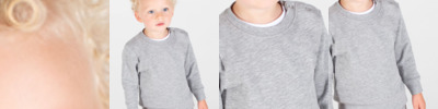 80% cotton/20% polyester. Brushed back fleece. Knitted ribbed collar, cuffs and hem. 6-12m to 24-36m have a popper closure on left shoulder. Twin needle stitching.