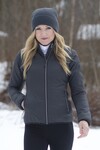 Polyamide ripstop quilted body. 90% polyester/10% elastane contrast shoulders, sides and back. Polyester padding. Showerproof. Full length contrast zip. Two front zip pockets. Elasticated bound armholes and hem. Access for decoration.