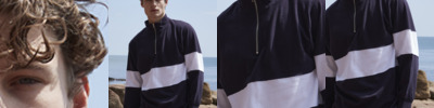 100% ringspun cotton. Heavyweight single jersey. Self fabric funnel neck. Herringbone taped neck and side vents. Topstitching around neck, armholes and panels. Metal zip and puller. Contrast stripe panel across chest and sleeves. Elastane reinforced ribbed cuffs. Side vents. Drop tail. Twin needle stitching. Tag free.