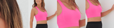 92% nylon/8% elastane. Double layer interlock. Seamless knit. Fitted crop top. Racer back style. Tear out label.