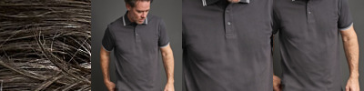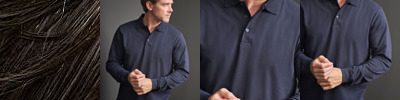5.9 oz/yd2 / 200 gsm, 92% cotton, 8% Spandex jersey; Moisture-wicking and antimicrobial performance; Two-piece mandarin collar with hidden three-button placket; Dyed-to-match buttons; Side vents; Stretch performance; Active fit; Easy care;