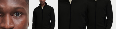 Two layer stretch soft shell. 96% polyester/4% elastane outer. Polyester fleece lining. Showerproof. Shaped fit. Collar high full length zip. Two front zip pockets. Open cuffs and hem. Curved drop hem.
