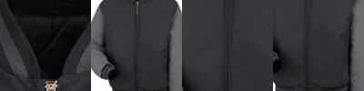 Outer shell of 100% nylon taffeta; Body,sleeves,hood: 75% polyester/13% rayon/12% cotton grey heather fleece; Water-resistant; Front zipper with inside storm flap; Hood with drawcord and sliders; Set-in sleeves for maximum mobility; Reinforced slash front pockets with zippers; Elastic cuffs and bottom; Woven label;