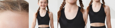 Active crop top and racerback. Self-fabric mesh inserts on front straps, V insert on front and on racerback panel. Self-fabric binding around neck, armholes and back. Tombo tear-out label.