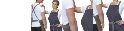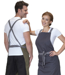 Self-fabric ties that are fastened to the main body of the apron with dungaree style buckles. The straps then hook over the shoulders, cross over at the back, loop through the large eyelets at the waist and tie neatly at the back. Also features a useful front centre pocket with combined pen slot. This style is designed to be paired with our PR119 Interchangeable apron straps should you want a contrast colour or fabric to the main body of the apron.