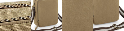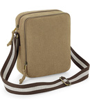Washed cotton canvas. Two tone webbing adjustable shoulder strap. Main zip compartment. Front zip pocket. Tear out label. Capacity 3.5 litres.
