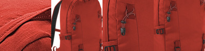 600D polyester ripstop. Water resistant fabric. Grab handle. Padded adjustable shoulder straps. Adjustable waist and chest straps. Side compression straps. Padded breathable back panel. Walking pole holders. Main zip compartment. Internal zip pocket with key clip. Expandable side pockets. Tear out label. Capacity 20 litres.