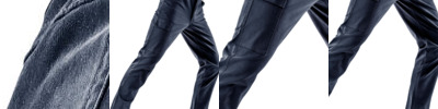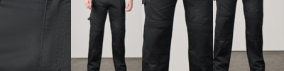 65% polyester/35% cotton. Part elasticated waistband with belt loops.Zip fly with stud over.Two front tradesman pockets.Two side pockets.Rear patch pockets.Two multi-use side leg cargo pockets.Ruler pocket.Media pocket.Hammer loop.External tear release knee pad pockets.Twin needle hem.