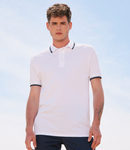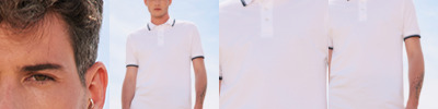 100% ringspun combed cotton. Ribbed knit collar and cuffs with contrast tipping. Taped neck. Three self colour button placket. Contrast taped side vents. Twin needle hem.