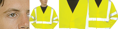 100% polyester. Conforms to EN ISO 20471: 2013 + A1: 2016 class 3.Polyester bound edges.Tear release front closure.Two reflective bands around the body, sleeves and one over each shoulder.
