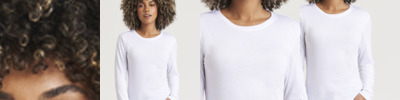 50% polyester/25% viscose/25% cotton. Soft touch. Ladies fit. Ribbed collar. Taped neck. Side seams. Twin needle stitching. Unbranded size label.