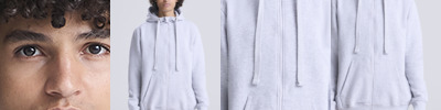 Heather grey 65% ringspun cotton/35% polyester. Soft cotton faced fabric.Brushed back fleece.Drop shoulder style.Three panel, single jersey lined hood with flat lace drawcord.Full length plastic zip with chin guard.Front pouch pockets with flatlock stitching.Ribbed cuffs and hem.Tear out label.