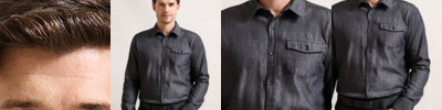 Long sleeve denim shirt with contrast stitch detail with left breast pocket. Buttoned cuff and sleeve guard. Curved hem. Back yoke.