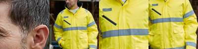Ripstop polyester outer. Conforms to EN ISO 20471: 2013 + A1: 2016 class 3 and EN342: 2004.RIS-3279-TOM (orange only).Waterproof with taped seams.Windproof and breathable.Soft touch removable pile lining.Pile lined collar with concealed detachable hood.Full length heavy duty two way zip with tear release storm flap.Two reflective bands around the body, sleeves and one over each shoulder.Radio loop.Contrast right chest zip pocket with concealed ID card holder.Left sleeve pen and media pockets.Two front patch pockets with side handwarmer entry.Tear release adjustable cuffs with inner storm cuffs.Adjustable hem with drop tail.Twin needle stitching.Zip access for decoration.