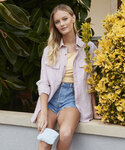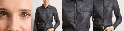 Contrast tipped details on collar, placket, arm cuffs and side vents. Side panels for a fitted shape. Bust and back darts. Three button placket.