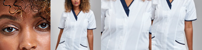 65% polyester/35% cotton twill. Easy care fabric. V neck with contrast trim. Covered front zip closure with popper above. Side and back pleats for fitted styling. Curved front pockets with contrast piped edge. Two PU lined pen pockets. Industrial laundry 85°C. Domestic wash 60°C. Co-ordinates with PR514