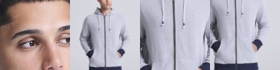 Long sleeve regenerated cotton zoodie with brushed inner and peached outer face. Features include set-in sleeves, contrast rib at cuffs hem, full length front zip and kangaroo pocket.