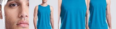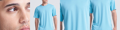 Sporty fit. Neoterictm textured fabric with inherent wickability. UPF 30+ UV protection. Self fabric bound neck and armholes. Curved back hem. Twin needle hem.