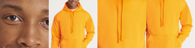 85% polyester/15% ringspun cotton. Brushed back fleece.Drop shoulder style.Double fabric hood with self colour flat lace drawcord.Front pouch pocket.Ribbed cuffs and hem.Twin needle stitching.Tear out label.