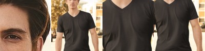 - Fashionable mitered-V rib collar with shoulder-to-shoulder taping