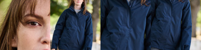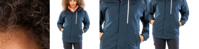 Windproof and waterproof with taped seams. Hood with drawstring. Feminine ¾ length. Water-repellent finish (Bionic Finish® ECO). Windproof. Water resistance: 3000mm. Breathability: 3000gsm/24h. Critically taped seams.