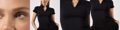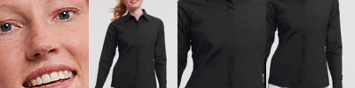 75% cotton/25% elastomultiester (LYCRA®T400®). Moisture management fabric.Fitted style.Neat modern collar.Concealed placket.Princess panels, no side seams.Back darts.Cocktail cuffs.Curved hem.