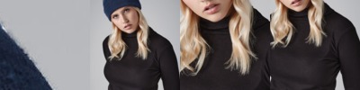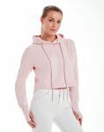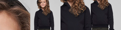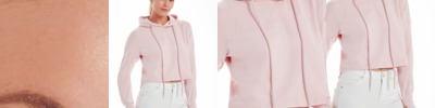 Ribbed cuffs and hem, outer fabric hood without drawstring, short cut and half-moon neck.