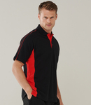 100% cotton micro piqué. Taped neck. Raglan sleeves. Three button placket with contrast inner and contrast buttons. Piping on shoulders and sleeves. Contrast side panels. Taped side vents. Twin needle sleeves and hem.