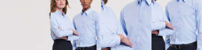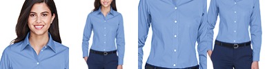 4.1 oz., 60% cotton, 40% polyester; fine yarn count shirting; true Non-iron performance straight from the dryer; stain release finish; patented pucker-free seams; specially fused collar, cuffs and placket; split back seam with bias cut back yoke; pearlized buttons; straight collar; front and back princess seams for flattering feminine fit; bust darts for a flattering feminine fit;