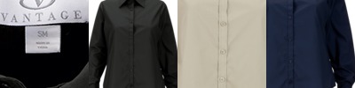 3.4 oz., 55% cotton, 45% polyester; Fine yarn count shirting; True Non-iron performance straight from the dryer; stain release finish; Patented pucker-free taped seams; Fused collar cuffs and placket; Split back seam with bias cut back yoke; pearlized buttons; straight collar; front and back princess seams for a flattering feminine fit; bust darts for a flattering feminine fit;