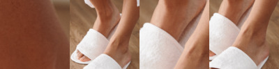 100% cotton towelling/mixed fibre soles. Open toe cotton terry outer.Soft padded sole.