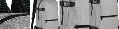600D polyester. Grab handle. Padded adjustable shoulder straps. Compression side clips. Main zip compartment. Front zip pocket. Padded laptop compartment. Capacity 13 litres.