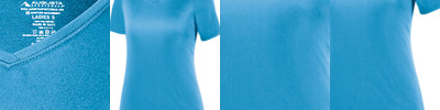 100% polyester wicking knit with true hue technology; True hue technology prevents dye migration; Wicks moiusture away from the body; Ladies' fit; Updated fit has longer length and bigger chest for added comfort; Tear away label; V-neck collar; Raglan sleeves;