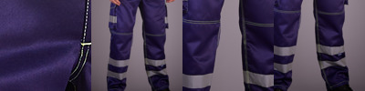 65% polyester/35% cotton twill. Windproof and breathable.Expandable waistband with belt loops.Zip fly with button over.Cargo pockets on both legs with reflective trim.Rear pockets.Hammer loop.Knee pad pockets.Critical stress point bar tacking.Twin needle stitched seams.2" hem.Tag free.