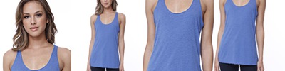 4.3 oz., 50% polyester 25% cotton 25% rayon ; 30 singles ; Side seams; retail fit; Tear-away label; Racerback; Comfortable relaxed scoop neckline; Made in a W.R.A.P. certified factory;