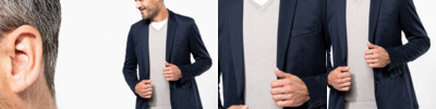 Light grey heather 74% polyester/24% viscose/2% elastane. Night navy heather 80% polyester/18% cotton/2% elastane.Light grey heather 74% polyester/24% viscose/2% elastane.Interlock knit.Poly/cotton lined body, taffeta lined sleeves.Two button single breasted.Buttonhole on lapel.Left chest pocket.Two inner button pockets and one media pocket.Two front pockets with flaps.Double vented back.Four button cuffs with contrast stitched buttonhole.Zip access at left chest for decoration.