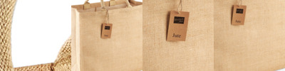 Laminated jute. Cotton carry handles (37cm long).Capacity 29 litres.