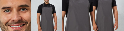 100% polyester with polyurethane coating. Waterproof and bleach resistant fabric.Self fabric neckband with plastic adjustable buckle.Self fabric 90cm ties.Width 72cm.Length 86cm.Industrial laundry 85°C.Domestic wash 60°C.